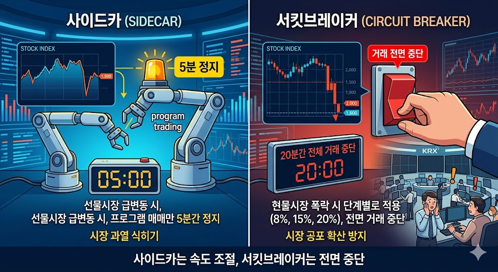 사이드카는 선물시장이 급등하거나 급락할 때 프로그램매매 호가 효력을 5분간 일시 정지해 현물시장 충격을 줄이는 제도입니다. 이 글에서는 매수 사이드카와 매도 사이드카의 뜻, 코스피·코스닥 발동 조건, 서킷브레이커와의 차이, 초보 투자자가 꼭 알아야 할 핵심만 쉽게 정리합니다.