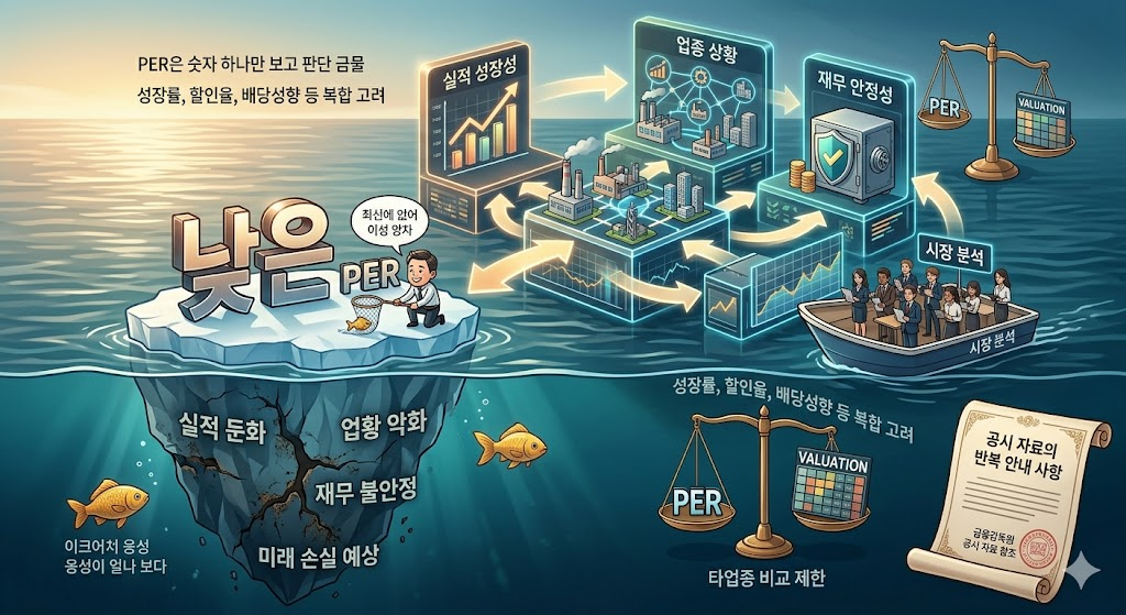 결론부터 말하면 그렇지 않습니다. PER이 낮다는 것은 이익 대비 주가가 낮다는 뜻일 수 있지만, 반대로 시장이 앞으로 실적 둔화나 업황 악화를 예상하고 낮게 평가하는 경우도 있습니다. 그래서 PER은 숫자 하나만 보고 판단하면 안 되고, 실적 성장성·업종 상황·재무 안정성과 함께 봐야 합니다. PER 비교평가에는 성장률, 할인율, 배당성향 등 여러 요인이 함께 작용하고, 같은 업종이 아니면 한계가 크다는 점도 공시 자료에서 반복해서 안내됩니다.